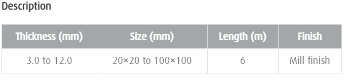 Hidayath offers equal leg angles with legs of the same length. They are perfect for frames, brackets, railings, and structural projects. Common sizes: 20x20x3 mm, 50x50x5 mm, 100x100x10 mm.
